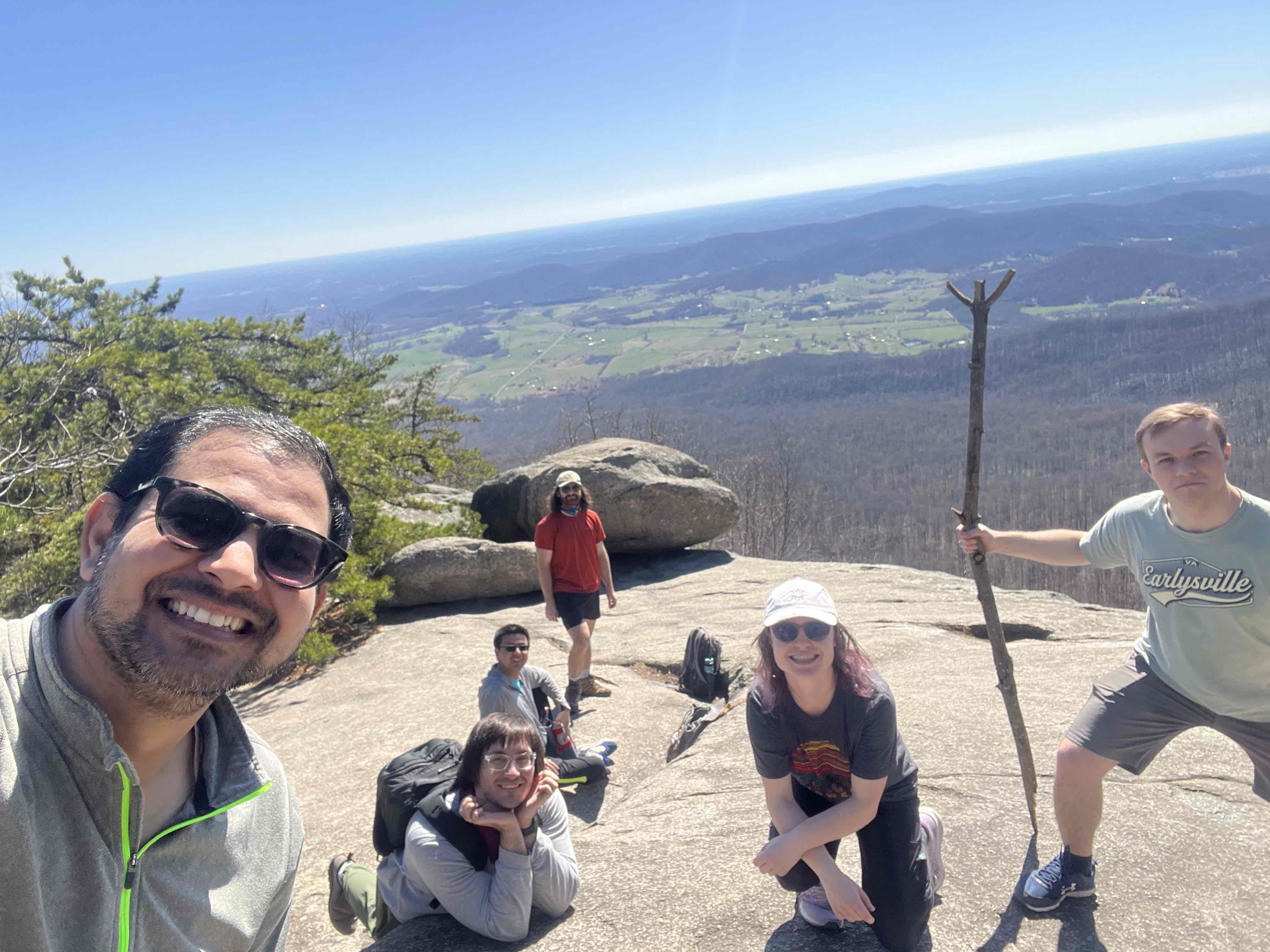 Shenandoah is beautiful year-round, but the best season for hiking is spring (April to June) and fall (September to November). However, one can go there in March also, which we did. I have been to Shenandoah in both seasons mentioned above and yes, it is awesome to experience it. The temperature is moderate in these seasons, and the park is alive with blooming wildflowers or vibrant autumn foliage. On our way we found lots of enthusiastic hikers like us. This trip was organized by the Physics Graduate Student Association of William & Mary, a second-oldest in the USA, and a Public-Ivy league university on the eastern peninsula of Virginia. We all had our hiking boots on as they are really helpful for your ankle and uneven terrain. In terms of clothing, we dressed in layers to adapt to the changing weather conditions. Its windy when you gain heights so layered clothes preferred. We also had personal backpacks, which had water, snacks, a first-aid kit, map, and a wooden trident ( our friend found it on the way and thought to take it to the top).